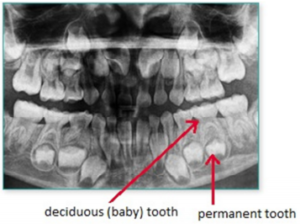 An x-ray that illustrates the risk of how replanting a primary tooth could adversely affect the underlying permanent tooth.