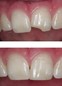 This photo shows an example of how broken or chipped teeth can be restored using bonding tooth colored materials.